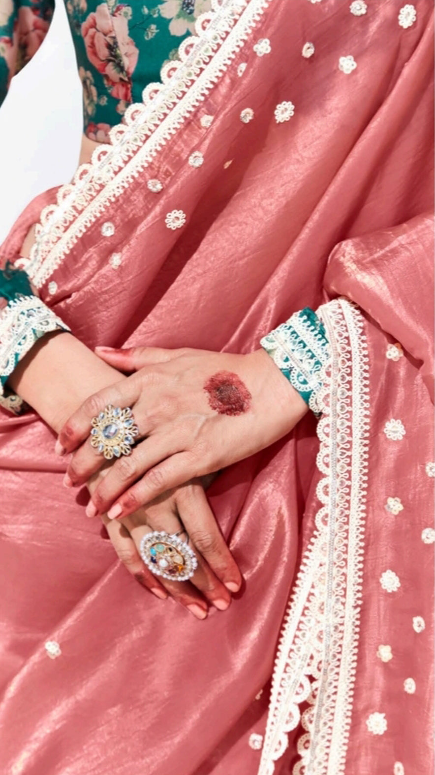 Coral saree in glaze organza with dark teal printed unstitched blouse