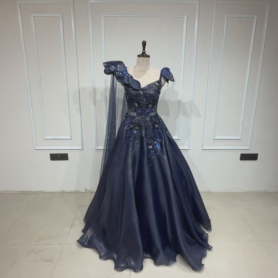 Deep blue engagement gown with cut dana & crystal in shimmer organza
