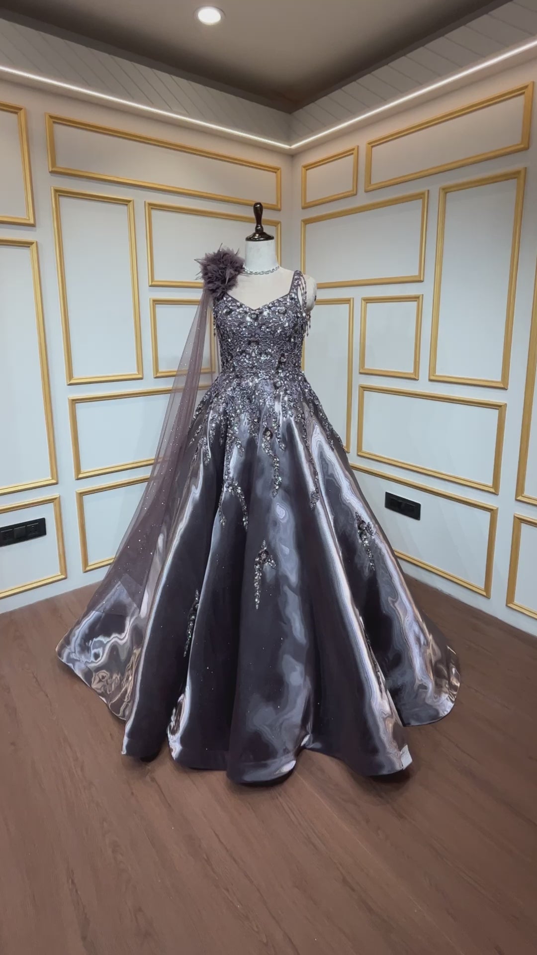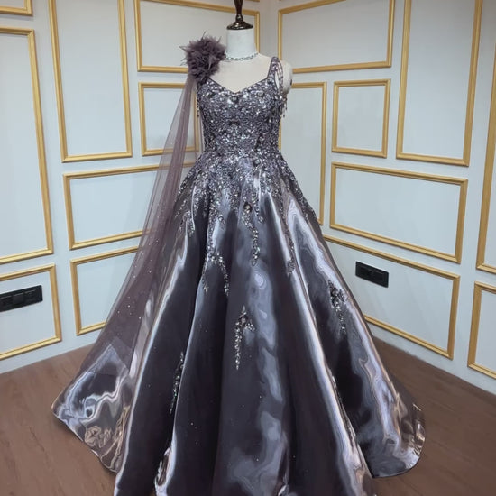 Espresso brown ball gown with sequins & crystal in liquid organza