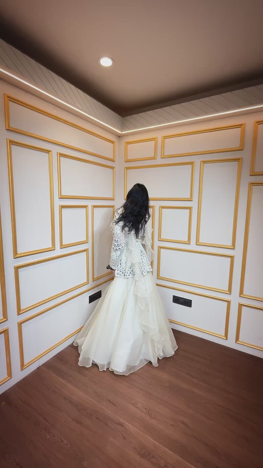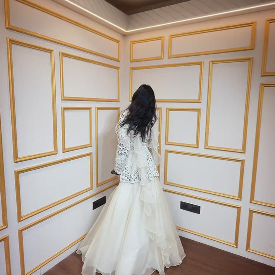 Ivory peplum top with pearl & zarkan work in net along with organza skirt