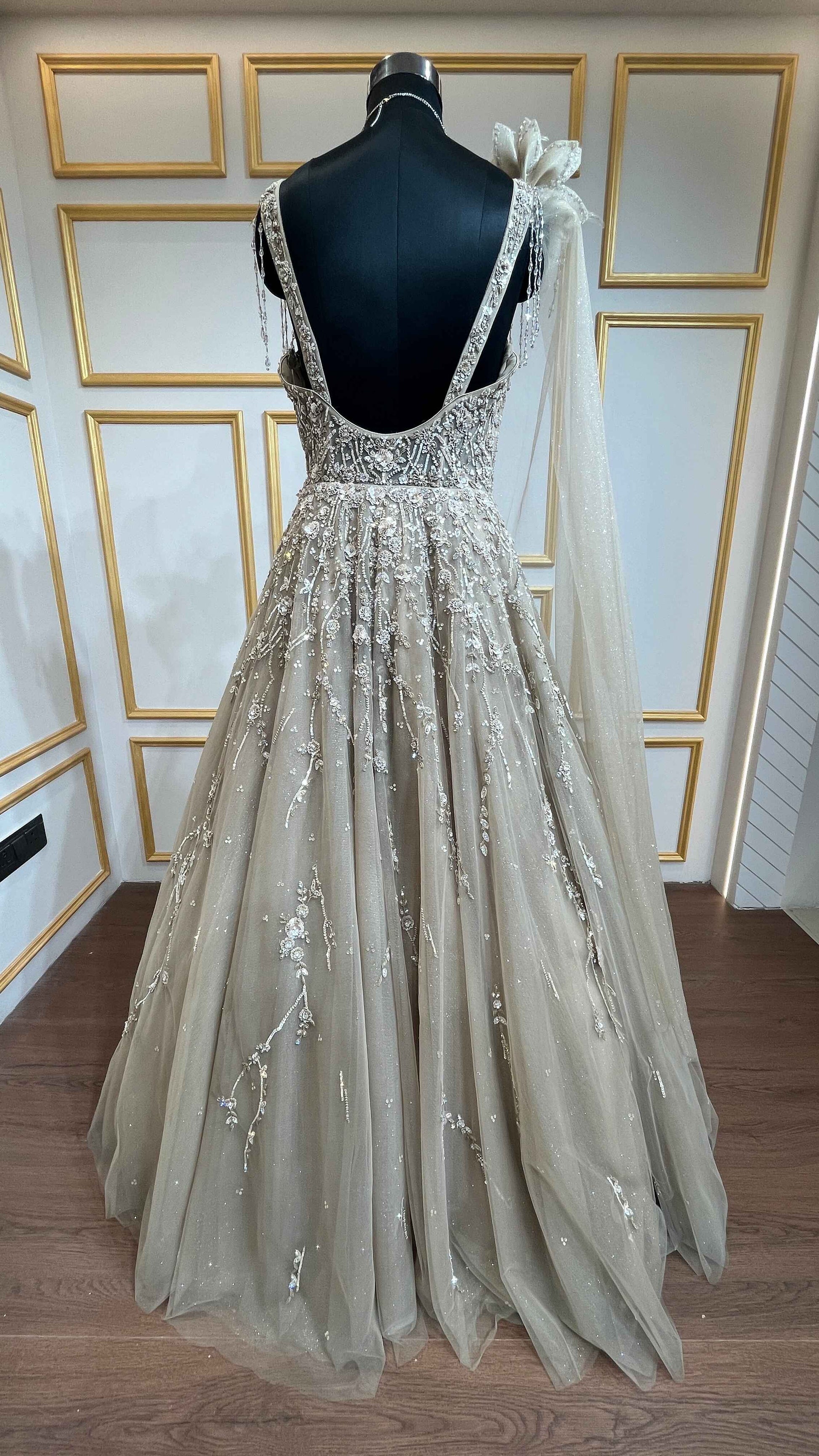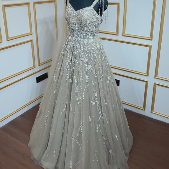 Khaki engagement gown with cut dana & crystal in net