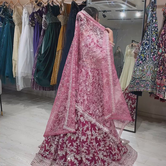 Magenta lehenga with zari & mirror on net with heavy dupatta