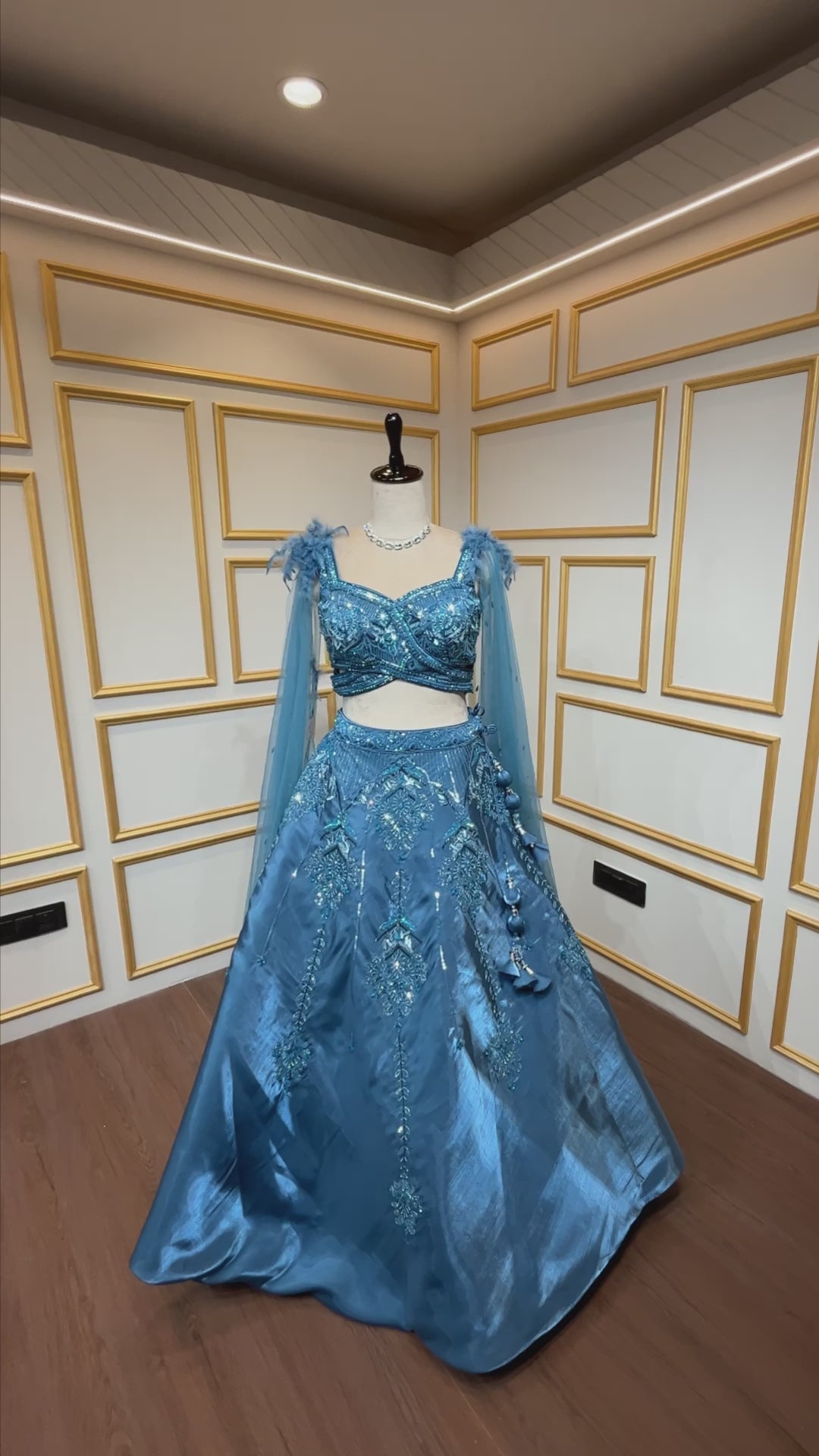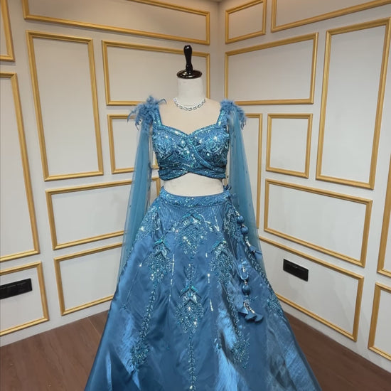 Metallic blue organza tissue lehenga choli with sequins & zarkan