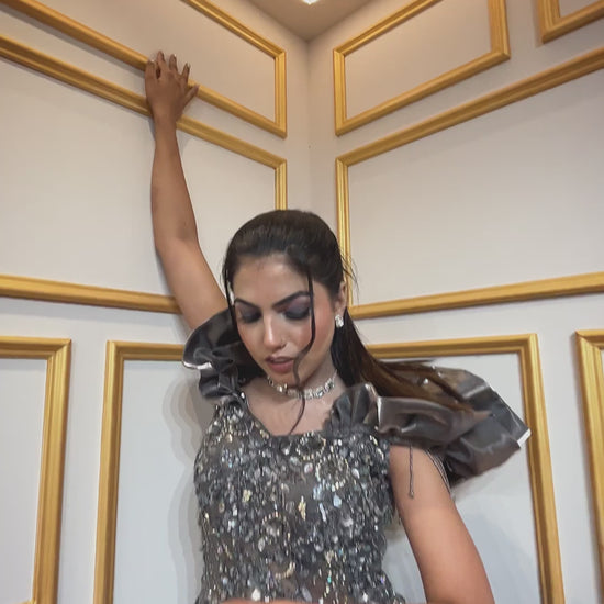 Metallic Grey engagement gown with pearl & crystal in organza