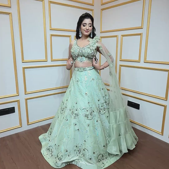 Mint green engagement lehenga with sequins & pearl work on organza