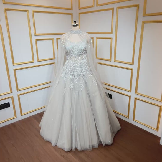 Net engagement gown with zarkan & cut dana work and detachable neck collar in nude beige