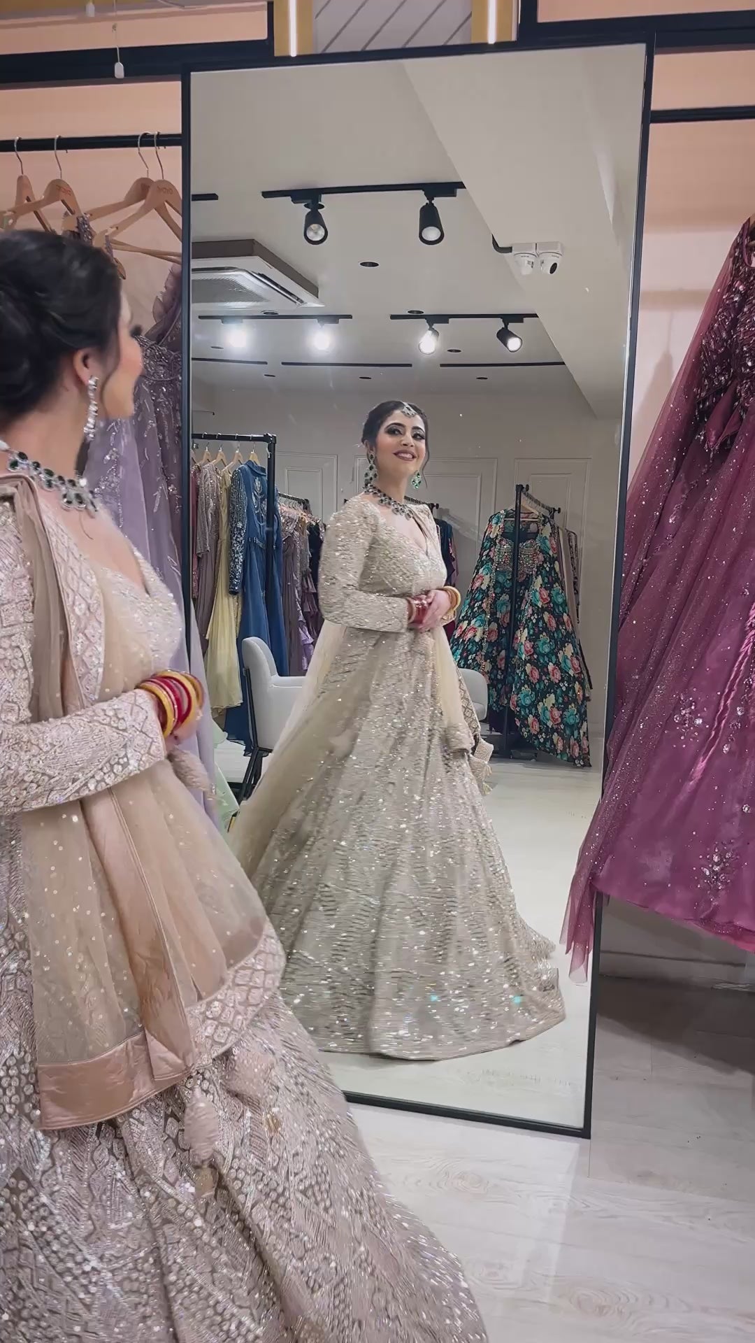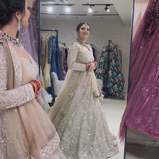 Nude color net bridal lehenga with zarkan & sequins along with heavy dupatta
