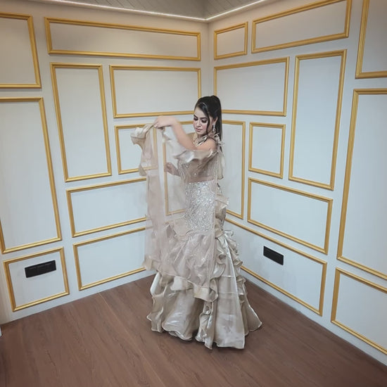 Organza mermaid lehenga with zarkan & pearl golden beige