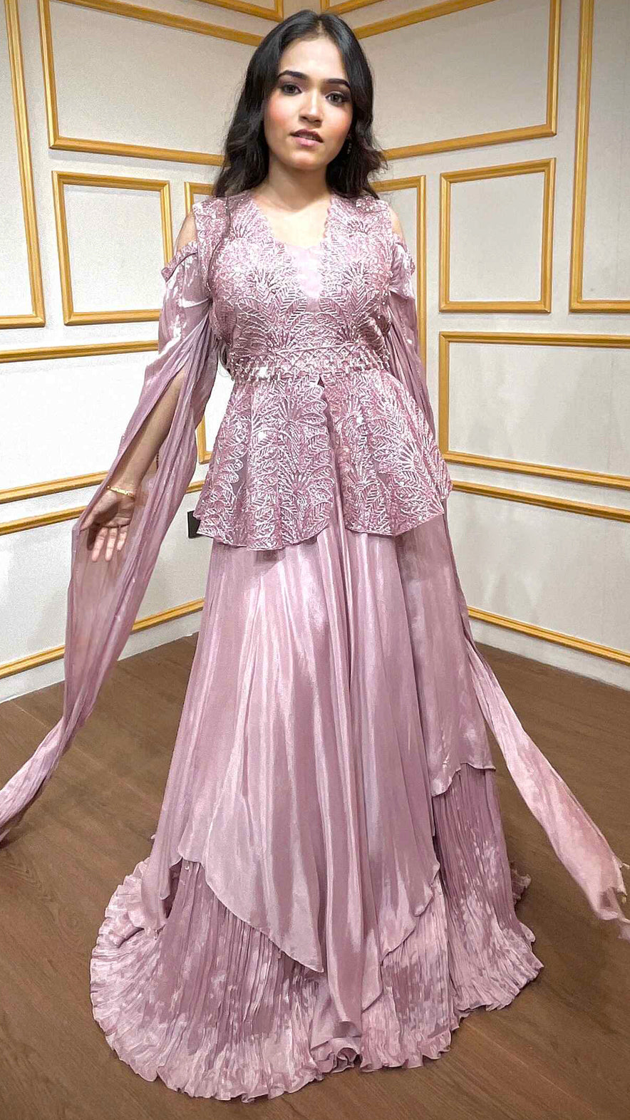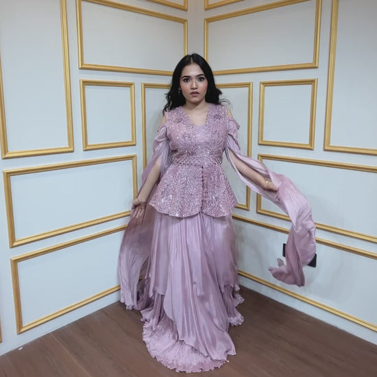 Peplum top with skirt with zari dori & sequins in crepe pink