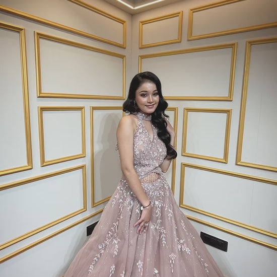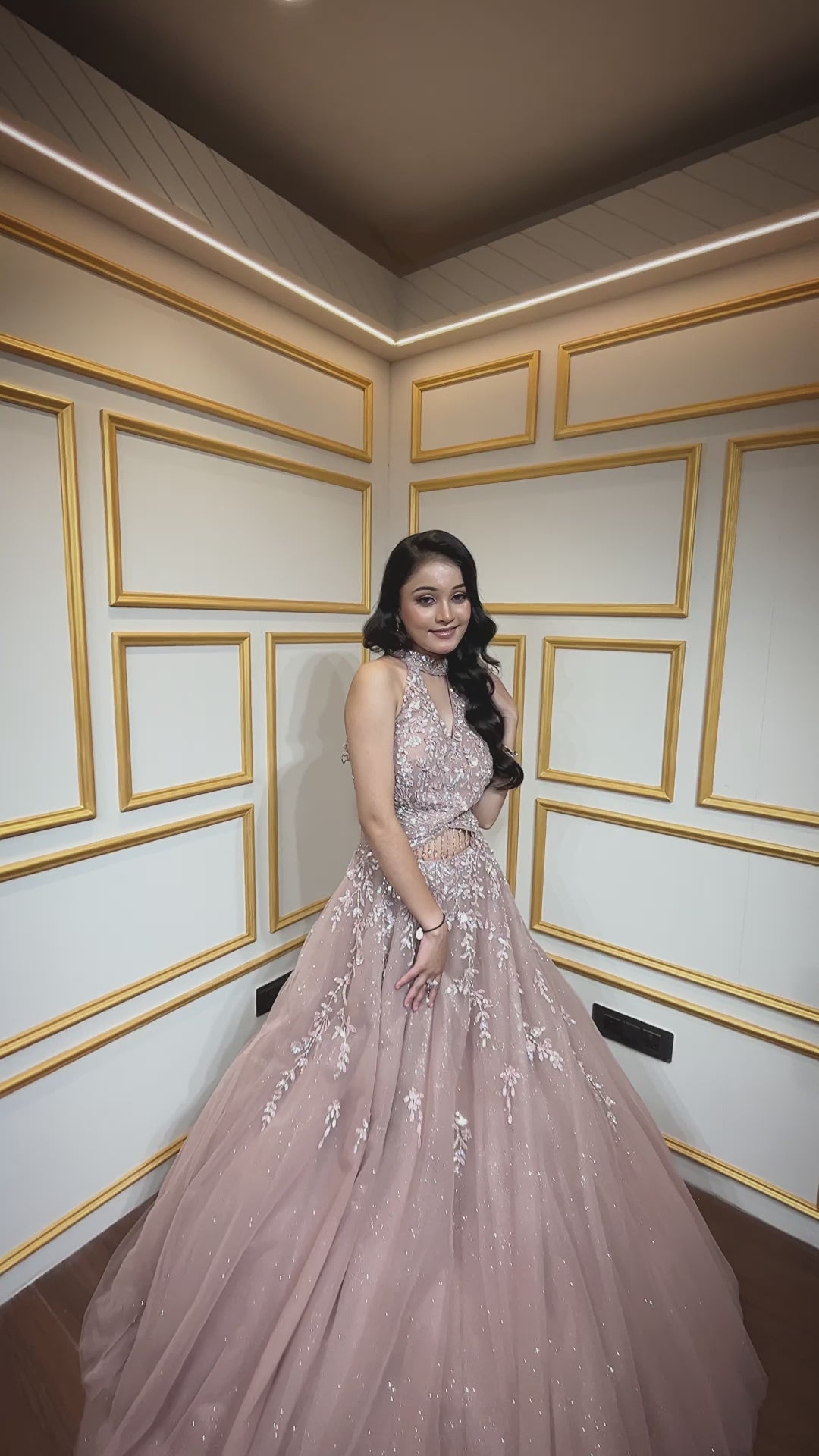 Rose gold engagement gown with cut dana & crystal in net along with peephole detailing